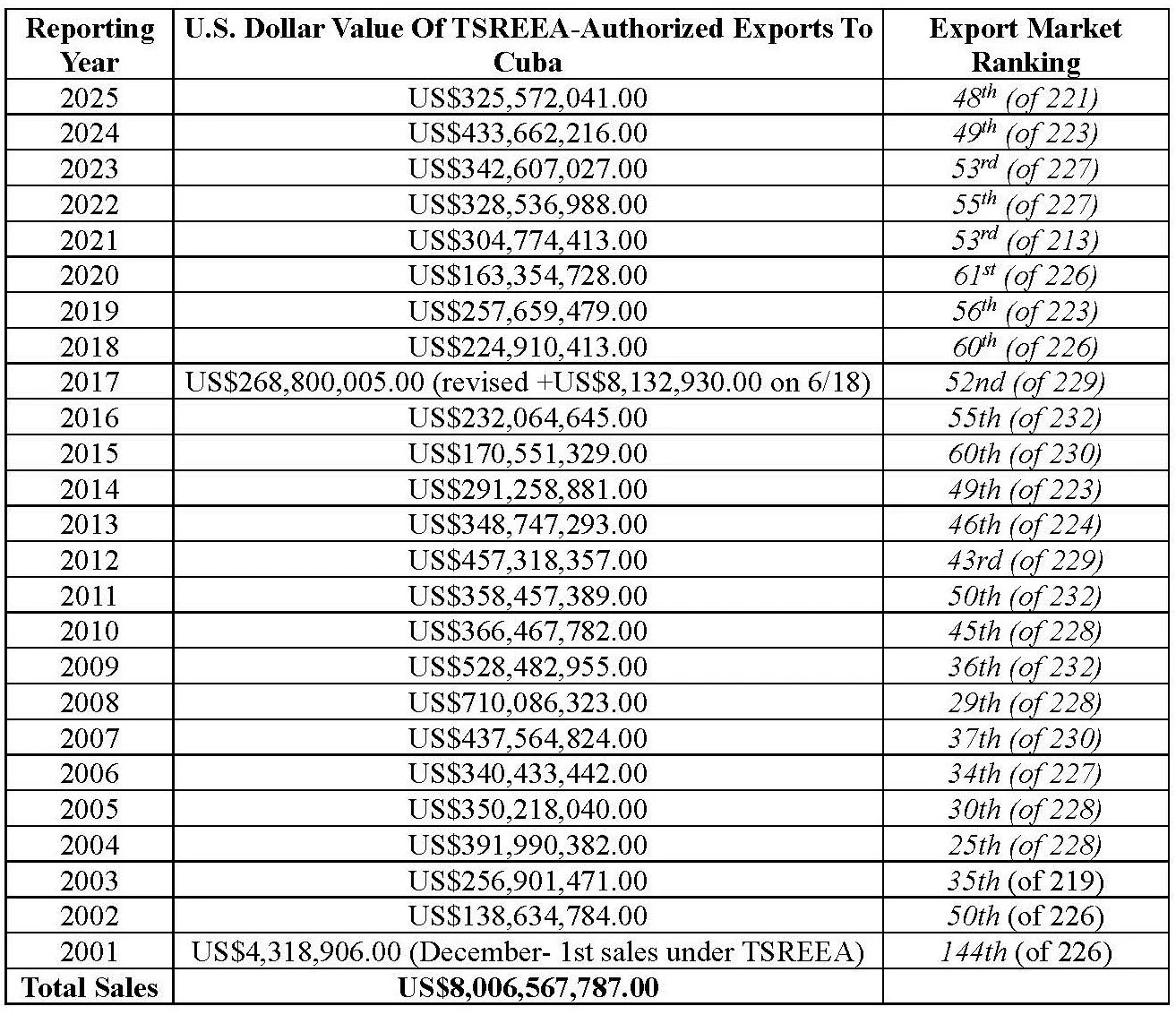 Milestone Reached: U.S. Ag/Food Exports To Cuba Exceed US$8 Billion Since First Deliveries In December 2001