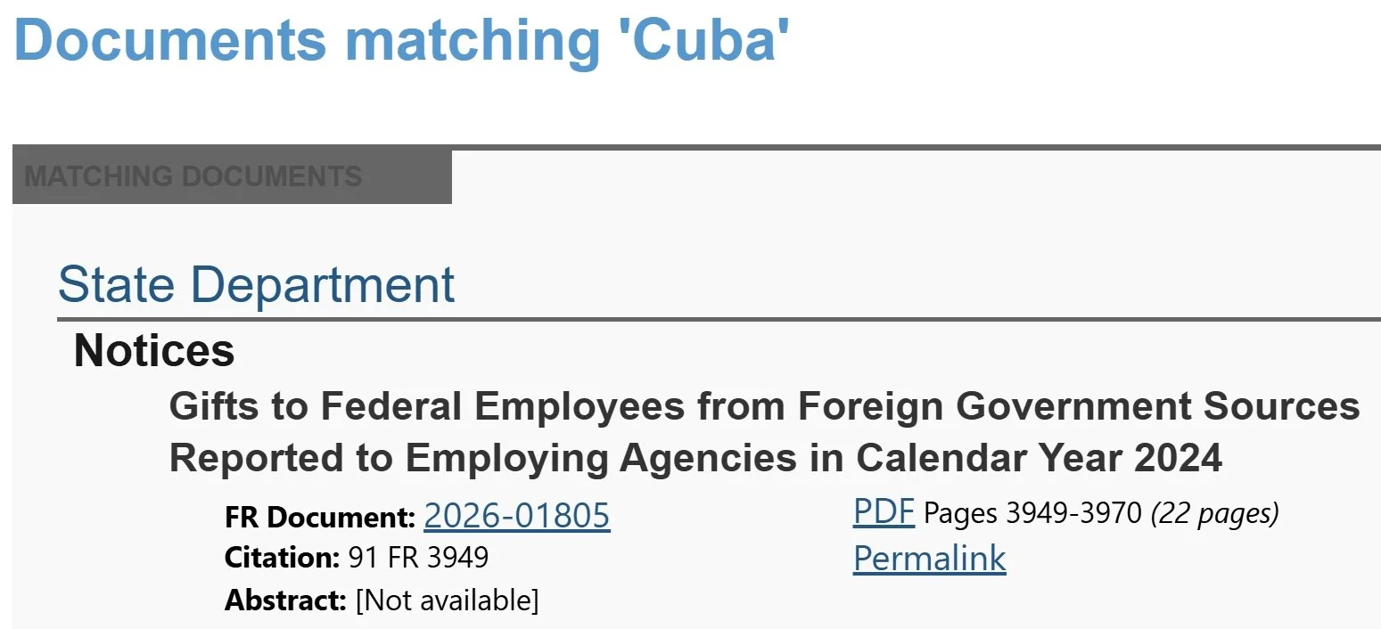 All information reported to the Office of the Chief of Protocol, including gift appraisal and donor information, is the responsibility of the employing agency, in accordance with applicable law and GSA regulations. The Office of the Chief of Protocol, Department of State, submits the following comprehensive listing of the statements which, as required by law, federal employees filed with their employing agencies during calendar year 2024 concerning gifts received from foreign government sources. The compilation includes reports of both tangible gifts and gifts of travel or travel expenses of more than minimal value, as defined in 5 U.S.C. 7432 and GSA regulations. For calendar year 2024 (January 1, 2024 through December 31, 2024), minimal value is $480.00. Consistent with Title 22 of the Code of Federal Regulations Section 3.4, the report includes all reported gifts given on a single occasion when the aggregate value of those gifts exceeds minimal the State Department’s Office of the Chief of Protocol’s request for data. The U.S. Senate maintains an internal minimal value of $100; therefore, all gifts over the $100 limit are furnished in the U.S. Senate report. value. Also included are one gift from 2017, one gift from 2021, three gifts from 2022, and nineteen gifts from 2023. These latter gifts are being reported in this year’s report for calendar year 2024 because the Office of the Chief of Protocol, Department of State, did not receive the relevant information at the time of reporting to include them in earlier reports. Agencies not listed in this report either did not receive relevant gifts during the calendar year, did not transmit a listing to the Secretary of State of all statements filed during the preceding year by the employees of that agency pursuant to 5 U.S.C. 7432(f)(1), or did not respond to Authority: Section 7342(f) of Title 5, United States Code, as added by Section 515(a)(1) of the Foreign Relations Authorization Act, Fiscal Year 1978 (Pub. L. 95–105, August 17, 1977, 91 Stat. 865). Jason S. Evans, Under Secretary for Management, U.S. Department of State.